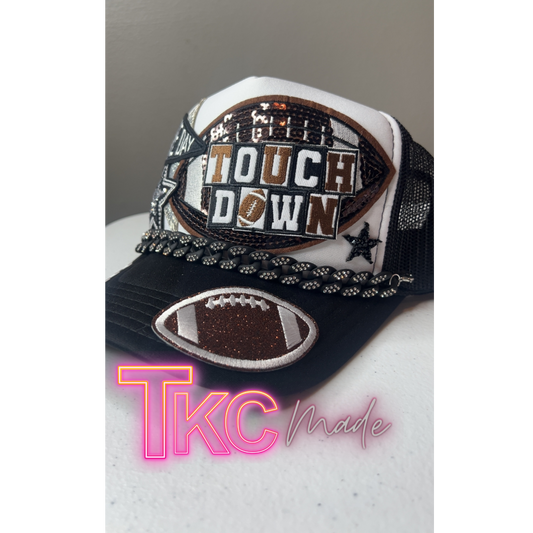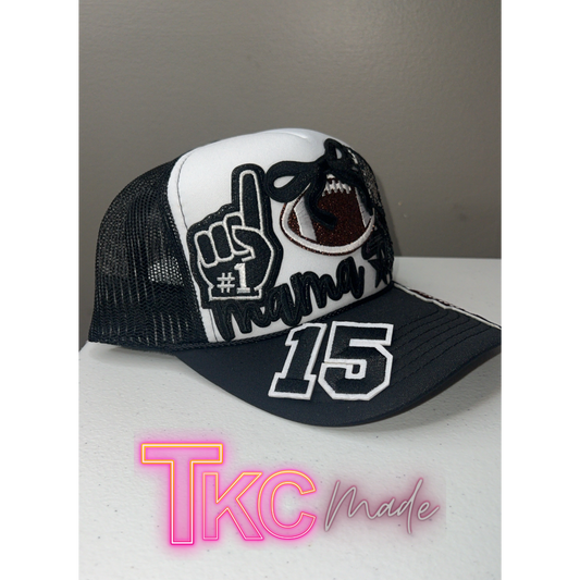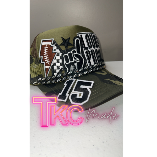 Green Camo Football Mama black trucker hat custom player number option and bling chain