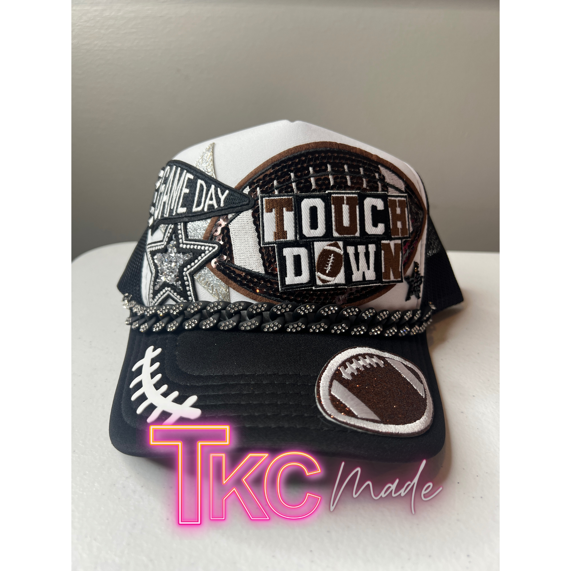 Football trucker hat with bling Touch Down with bling hat chain