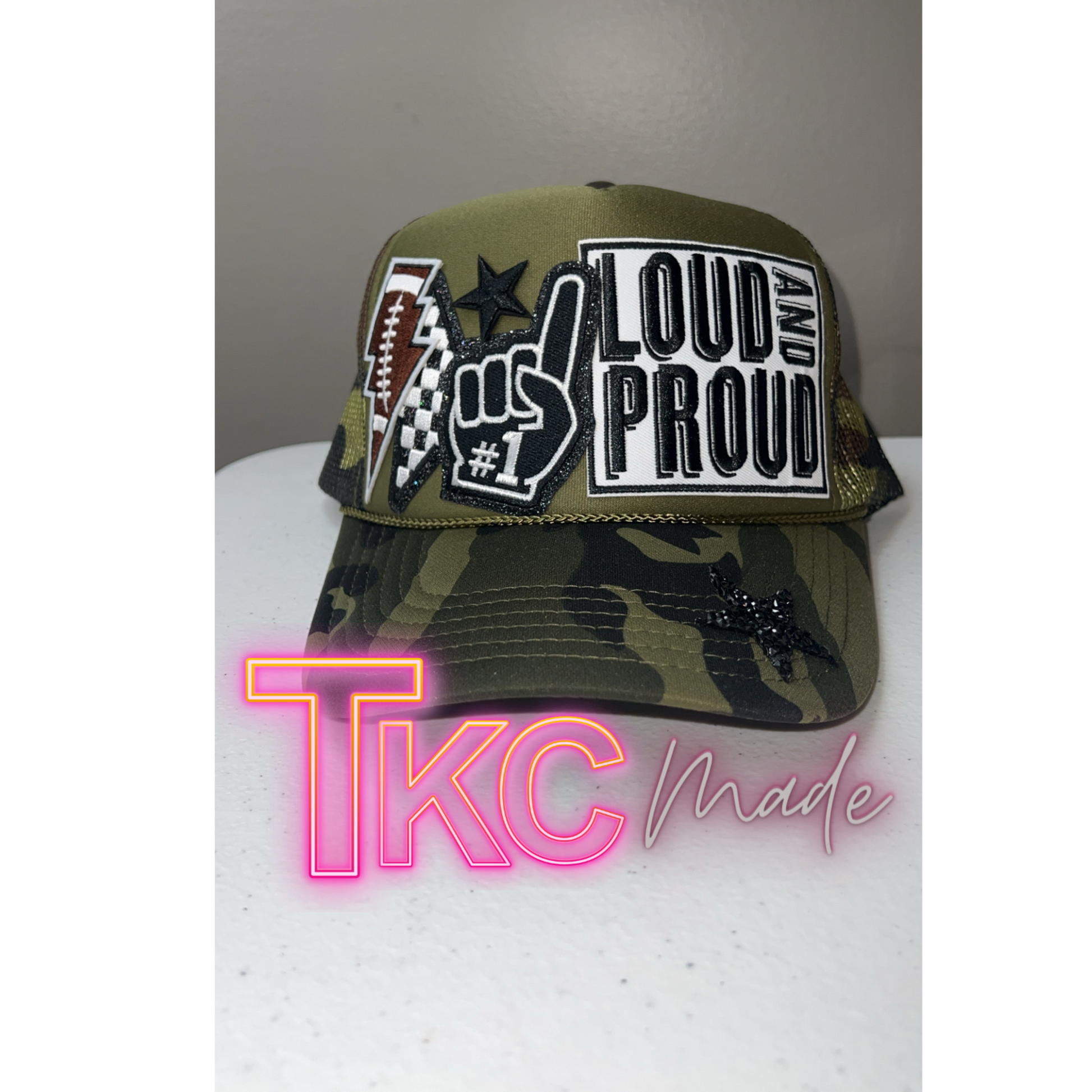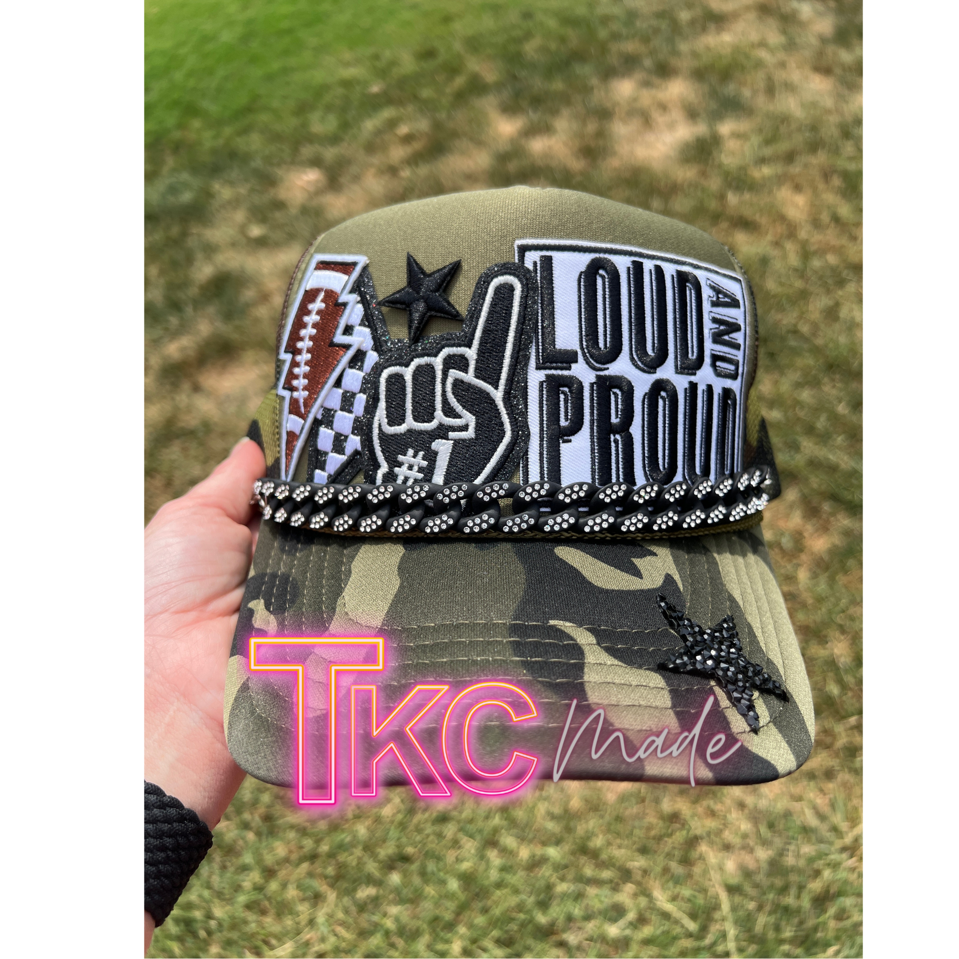Green Camo Football Mama black trucker hat custom player number option and bling chain